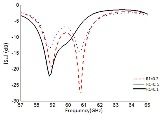 The spacing between the double T-shapes (D2) was also optimized using a parametric study in order to maintain a mutual coupling with the DGS, which was applied later. Three different spaces were tested 1, 3, and 4 mm; the results are shown in Figure 7. The space D2 of 3 mm introduced the lowest return loss and enhancement in bandwidth at the achieved band. Furthermore, a parametric study was carried out on the thickness of the rings etched in the ground plane, and the optimum thickness (R1) was obtained. The different thicknesses were tested, and the results are given in Figure 8. It could be demonstrated from Figure 8 that the best performance was achieved with thickness R1 = 0.1 mm since the antenna resonated at 58.9 GHz with a −10 dB return loss and a bandwidth of 2.38 GHz. After carrying out the necessary parametric study on the proposed antenna, Table 3 lists the optimum dimensions that qualify the antenna for 5G applications.