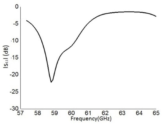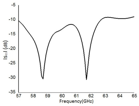 To investigate the performance of the proposed array, the model was simulated using the HFSS software. It could be seen from Figure 10 that the antenna array succeeded to resonate at dual frequencies (58.8 GHz and 61.75 GHz), and it could achieve −10 dB impedance bandwidth of 6.6 GHz from 57.2 GHz to 63.8 GHz. Moreover, the achieved return loss at both frequencies was −31 dB, confirming the suitability of the proposed array for 5G applications.
