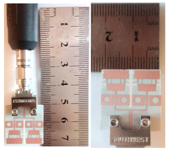 To examine the actual performance and validate the simulation results, the antenna array prototype was fabricated, and its performance in terms of S-parameters was measured by Rohde and Schwarz ZVA 67 vector network analyzer using 50X port. The fabricated 5G antenna array is depicted in Figure 14. For the measurement considerations, the ground plane, as well as the microstrip feeding line of the antenna prototype, was extended long enough for placing the commercial 1.85 mm end launch connector.