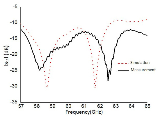 The spacing between the antennas and the connection method between them, as well as using an appropriate feeding network on the top plane and the addition of the two L-shaped slots as DGS on the bottom plane, enhanced the performance of the monopole antenna array. The proposed monopole antenna array had a wide bandwidth, which covered the range of 57.2–63.8 GHz, as shown in Figure 15, and the obtained bandwidth represented a 3.94% increase when compared to the bandwidth of the array reported in [28]. The measured results were consistent with the simulations since both curves cover the desired band for 5G technologies, as shown in Figure 15. However, there was a small discrepancy between them in terms of resonance frequencies and the values of the return loss at these frequencies. This could have happened due to the fabrication tolerance and mismatch between the connector and the proposed antenna array.