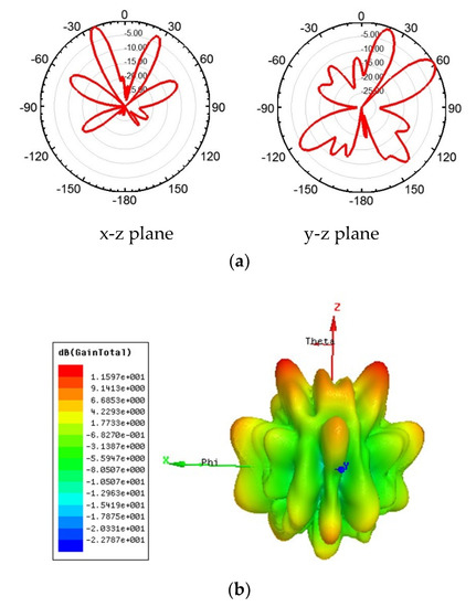 The 2-D and 3-D radiation patterns of the proposed array were simulated and are presented in Figure 16; the radiation efficiency of the proposed antenna array was over 85% with radiation power overlaps in one direction and a maximum gain of 11.6 dBi at 60.5 GHz, which was 0.93 dB higher than the gain achieved by the reported antenna array in [29]. Moreover, the size of the proposed antenna array was more compact than the presented antenna array in [30], which was utilizing the same band with a little difference in performance.