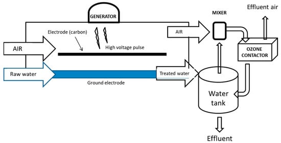 In non-thermal plasma processes (NTPs), high-voltage electrical pulses generate a corona discharge, which in turn excites electrons in the air above a liquid solution with an ionization effect, producing singlet oxygen atoms, which generate ozone and hydroxyl radicals in the underlying water layer []. In other alternative NTP configurations, dielectric barrier discharges, corona discharges in aerosols or in the water matrix itself, are applied without substantial differences in the products of the reactions sequence previously indicated (Equations (1)–(6)). NTP technology is confined to thin-layer low-flow applications, due to the limited water penetration of excited electrons. An example of a pilot-scale NTP unit is schematized in Figure 2. This ‘‘electrode-to-plate’’ scheme consists of two units: In the first, water flowing in a thin film (~5 mm) over a ground electrode (anode) is exposed to high-voltage pulses from a carbon fiber electrode (cathode). Electric pulses with a frequency in the range 500–1000 Hz, at maximum voltage of 8.0 kV, 100 A current, are released by a generator. Upon leaving this reactor, water enters an ozone contactor, where it is mixed with ozone-rich air (generated in the previous reactor’s headspace). Other configurations, such as wetted-wall or falling film reactors, have been used experimentally [,].