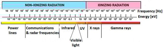 Non-ionizing and ionizing radiation ranges: frequency and energy.