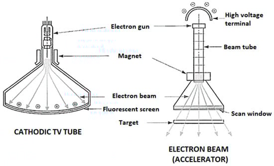 Gamma rays are still used in many experimental radiolysis studies, but, due to their high organic matter penetration, they require strong precautions and shielding protection to avoid harm to living cells. Furthermore, γ-ray sources are highly radioactive isotopes requiring periodical replacement and special (and costly) high-risk handling procedures. The efficiency of a γ-irradiation process depends on the “age” of the radiation sources, which determines the deliverable dose. EB technology, instead, does not rely on constantly decaying isotopes but on electromagnetic particle generation, and can therefore be turned off when the process is not needed, much like a television set. Old cathodic tube television sets were actually quite similar, in principle, but at lower energy, to modern electron accelerators (Figure 4). Safety and practical considerations have therefore contributed to widespread industrial adoption of EB, commercially used in many manufacturing processes requiring an improvement of the material properties by molecular modification (e.g., submarine data cables, membranes grafting, medical hydrogels), sterilization or disinfection (including food processing), and environmental areas (industrial flue gas treatment, sludge processing, textile effluents processing) []. However, despite the advantages of this practical process, few full-scale water and wastewater treatment applications have been reported to date [].