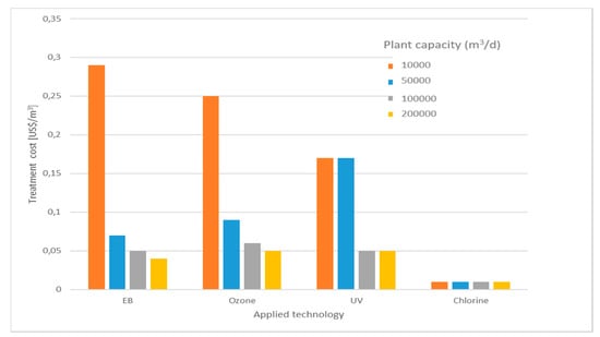 Specific total disinfection costs (US$/m3 treated) of urban effluents for irrigation reuse according to different technologies (data from []).