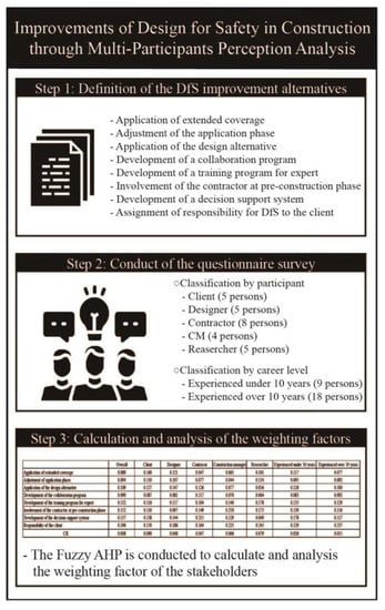 Therefore, in this study, eight alternatives were deduced for improving the DfS process in South Korea based on an analysis of previous relevant studies, after which the perceptions of improvements as held by construction project participants and based on different career levels were compared using weighting factors.