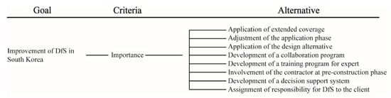 As shown in Figure 2, the AHP model consists of the following: “goal,” which is set for the improvement of DfS in South Korea; “criteria” for importance; and “alternative” for the eight DfS improvement alternatives (‘Application of extended coverage’, ‘Adjustment of the application phase’, ‘Application of a design alternative’, ‘Development of a collaboration program’, ‘Development of a training program for experts’, ‘Involvement of the contractor in the pre-construction phase’, ‘Development of a decision support system’, and ‘Assignment of responsibility for DfS to the client’).