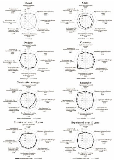 The contractor graph in Figure 4 shows that the priorities of the contractor respondents in this study with regard to the DfS improvement alternatives were generally similar to those of all other respondents. Unlike all other respondents, however, the contractor respondents placed relative importance on the ‘Development of a decision support system’ (0.215). This may stem from the fact that the contractors may end up applying a DfS improvement alternative that is not suitable for the site conditions. Therefore, if the designer suggests a DfS improvement alternative considering the site conditions in the design phase through the decision support system, the contractor will be able to apply a suitable DfS improvement alternative in the field. In addition, the contractors accorded greater importance to the ‘Development of a collaboration program’ (0.117) compared to all other respondents. As mentioned earlier, in South Korea the contractor cannot participate in the design phase because DfS is implemented only in conventional design-bid-build projects. For this reason, the contractor respondents recognized the need for the development of a collaboration program. Meanwhile, the contractors placed less importance on the ‘Application of extended coverage’ (0.047) compared to all other respondents because coming up with a DfS improvement alternative is not a prerequisite, and the commencement of construction may be delayed due to the extension of the design period.
