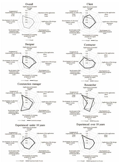 As shown in the graph of the respondents with more than ten years of experience in Figure 4, such respondents showed results similar to those of all other respondents. In particular, those with more than ten years of experience considered the ‘Assignment of responsibility for DfS to the client’ as relatively important (0.237) because they felt that the clients lack a sense of responsibility for safety management. As those with a wealth of experience also have great knowledge of construction safety in relation to the DfS process, they recognized that the ‘Development of a decision support system’ (0.117) is less important compared to all other respondents.