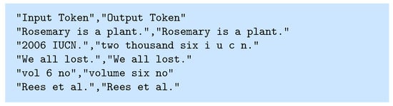- Sproat, R.; Jaitly, N. RNN Approaches to Text Normalization: A Challenge. arXiv 2016, arXiv:1611.00068. [Google Scholar]