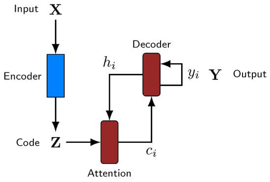 An encoder–decoder architecture with attention mechanism. X: Input sequence. Z: intermediate code. Y: Output sequence. : Output at instant i. : Context coefficients at instant i. : hidden states of the decoder at instant i.
