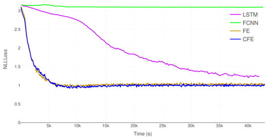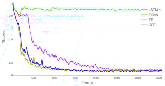 It can be observed that LSTM requires nearly 10 times more parameters than FE and CFE, while FCNN requires 2.5 times more parameters. This translates into a lower efficiency and speed of convergence of these models. In any case, the rest of the system (attention and decoder) has a considerably larger number of parameters, with about 6.3 million values that have to be trained. To initialize these parameters, the uniform method of Xavier [] was used.