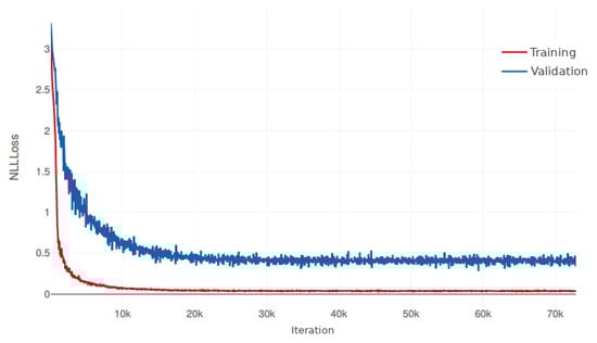 Finally, we discuss the results obtained on the third experiment. Figure 11 shows that, during training, the model quickly converged. There is a gap between training and generalization error that the model has not been able to solve. However, the results obtained on the test set are very promising: It achieved 92.74% accuracy and 5.44% CER, against the 99.8% accuracy and 13.43% CER obtained by the models of Sproat and Jaitly [] and Ikeda et al. [], respectively. However, this comparison with previous works has to be carefully taken, since there are differences that do not allow a direct comparison. For example, in the case of [], the dataset contains about 40 million sentences. This is translated into training times between 5 and 10 days using a system with eight GPUs. Compared to that, our method used 1 million sentences from the same dataset, and the training time was 22 h with 1 GPU. The difference is also in the underlying model of the encoder, which is a 4-layer bidirectional LSTM in [] and the convolutional CFE encoder in our case, both working at character level. Lastly, in order to achieve the best accuracy of 99.8%, an additional finite state filter is applied to guide the decoding, while our method is exclusively based on neural networks.
