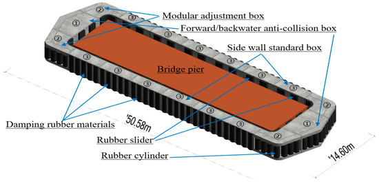 According to the relevant data, ship collision accidents are the leading cause of bridge collapses in different types of bridges all over the world, and the number is increasing year by year [1]. Ship collision accidents seriously affect the safe operation and service life of bridges, and can even cause large economic losses, casualties, environmental pollution, and harmful social impacts [2,3,4,5,6]. Therefore, ship–bridge collisions have become a problem of great concern. At present, the most commonly used collision avoidances in the world are artificial islands, double-wall steel cofferdams, steel floating boxes, suction pile [7], FRP(Fiber Reinforced Plastics) fenders, wood fenders, etc. [8]. However, artificial islands require a large amount of engineering, entail high costs, and occupy a large amount of navigable area, and steel collision avoidance systems have great stiffness and result in a hard contact with the pier. Additionally, the corrosion resistance of the whole system is poor, the maintenance process is complex, the damage scope is large when an impact occurs, and the maintenance costs are high. Since the strength of the material itself is low, fiberglass reinforced plastics and wood are able to meet the requirements. There are great limitations in terms of energy absorption.