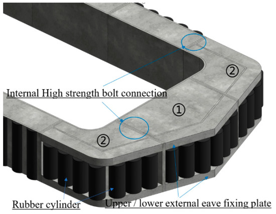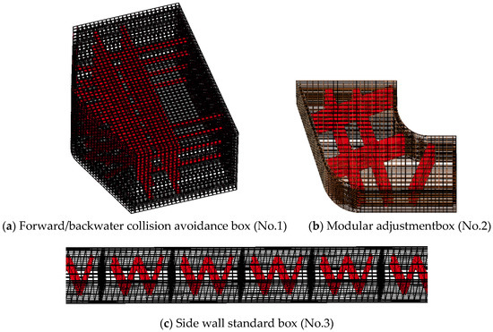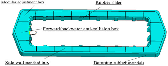 The collision avoidance is composed of 18 independent UHPC collision avoidance floating boxes connected by closed high-strength bolts [27]. The gaps between adjacent boxes are filled with asbestos cushion plates. Each single box is closed and can float at a fixed water level. Each collision avoidance floating box consists of a two-layer UHPC floating box with two-way dense reinforcement and internal supporting elements. The concrete protective layer on the wall of the box is 10 mm thick and RB500E steel bars with 100 mm spacing are used. A modular design is adopted for the box body. The device can be divided into three modules: Box No. 1 is the water distribution tank, Box No. 2 is the adjustment tank, and Box No. 3 is a sidewall standard box. The structural arrangement of the three modules is shown in Figure 1 while Figure 2 shows the detailed structure of the device end. The following three types of UHPC collision avoidance floats are briefly introduced.