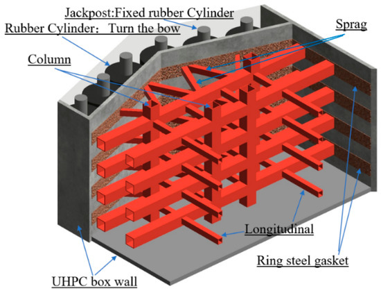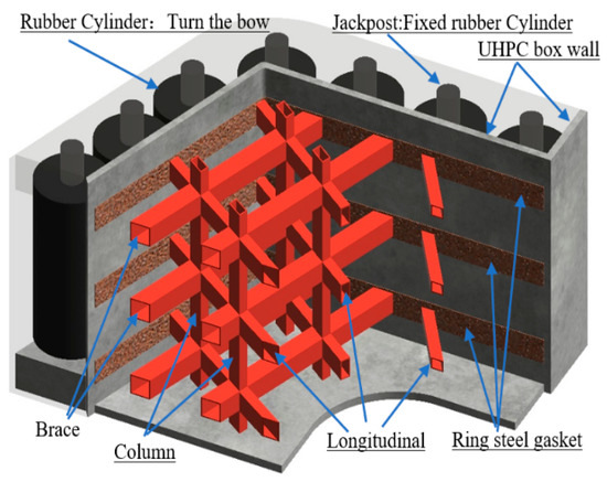 The collision avoidance float tanks on the upstream and backwater surfaces of the bridge piers are both Box No. 1 water distributors with a symmetrical structure that ensures the same protection effect when an upstream or downstream ship impacts a pier. They can reduce part of the additional water mass when a ship hits and turn the bow to change the direction of the impact. The rubber drum outside the box is fixed by a densely reinforced UHPC axle column, which has the characteristics of high strength, good toughness, and excellent durability. Box No. 1 is the main impact box when a ship–bridge collision occurs. Its spatial structure consists of a large number of thin-walled elements. The supporting elements are arranged inside and connected to the UHPC box wall through embedded shear elements. When a ship impacts a box, a large deformation occurs, and the energy dissipation depends on the UHPC box and internal supporting elements. The internal supporting elements include longitudinal braces, diagonal braces, transversal braces, and vertical braces. The cross-sectional dimensions of the longitudinal and diagonal braces are 140 × 140 mm, and the cross-sectional dimensions of the transversal and vertical braces are 200 × 200 mm. The internal structure form is shown in Figure 3.