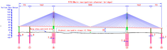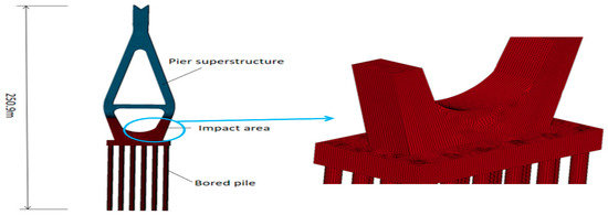 In this paper, the selected pier is representative of the #8 pier of the Honghe Bridge, across the Hongwan and Modaomen waterways. The span arrangement of the bridge is (73 + 162 + 500 + 162 + 73) m = 970 m, as shown in Figure 10, The tower height of the pier is 166.5 m, the elevation of the pier cap is −5.5 m, and 24 bored cast-in-place 2.8 m diameter piles are used in the foundation. The eight-node tetrahedral element SOLID164 is used to model the pier. The pier model is divided into upper and lower parts. There are 556,036 elements in total. Using single point Gauss integral and hourglass control, 500 mm is selected as the finest mesh size in the bridge contact area, as shown in Figure 11, and a relatively large mesh size is used to model the parts far away from the contact area. The pier itself has a high stiffness, the deformation of the pier is very insignificant and the influence of the superstructure on the lower structure is negligible in the process of a ship–bridge collision. Therefore, the concrete part above the pier collision area is modeled as a rigid body [36], with a Young’s modulus, E, value of 3.45 × 104 MPa, and a Poisson’s ratio, u, value of 0.2. The pier cap is embedded; thus, the pile foundation is fixed in the form of a foundation. The modeling length is equal to the actual length, which restricts the three-dimensional translational freedom of the element nodes at the pile bottom. The plastic model of the concrete material in the impact zone, which is composed of the failure envelope surface, the hardening cap surface, and the tension cutting limit surface, is the *MAT_GEOLOGIC_CAP model, which can better reflect the material’s nonlinear response under a large strain. Its parameters are shown in Table 2.