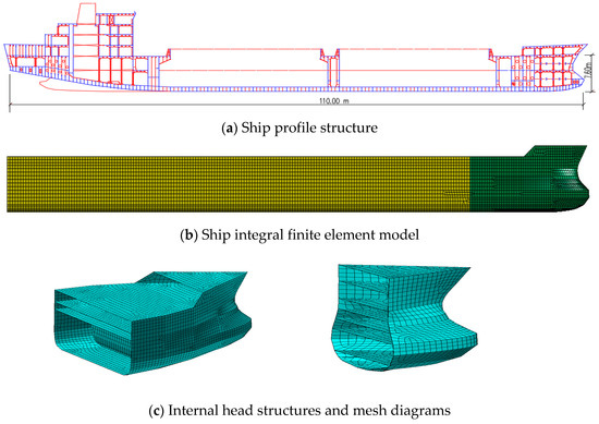 In this paper, a 5000 DWT river-sea direct cargo ship is selected as the representative ship for the calculations. The ship is divided into two parts, namely the bow and the hull. Since the deformation and failure of the hull are mainly concentrated in the bow of the ship during the impact process, and the hull will not undergo a large plastic deformation or experience a high stress phenomenon [37]. The hull head shell adopts 163 elements to model and accurately simulate the bow, inner keel, deck and bulkhead components according to the actual drawings, totaling 9630 elements. According to the rigid material model, there are 12,647 units. The ship structure and finite element model are shown in Figure 12.
