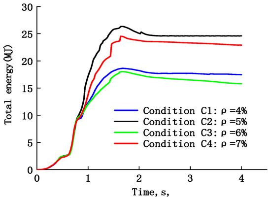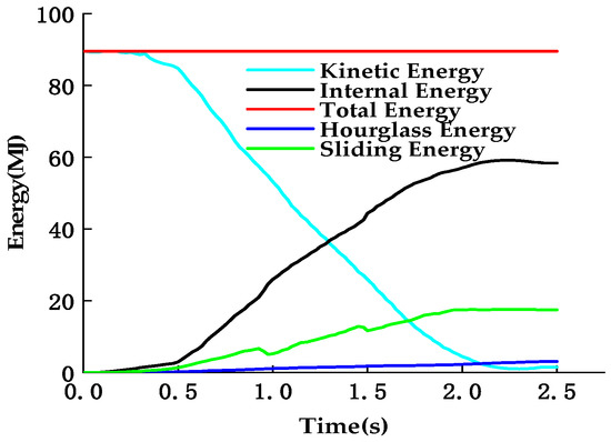 The system energy curves for Conditions A1, A2, and A3 are shown in Figure 13, Figure 14 and Figure 15. The total energy of the system is defined as the sum of the kinetic energy, internal energy, slip energy and hourglass energy. The total energy of the system is 89.49 MJ in the collision process, which satisfies the Energy conservation law. The internal energy values of the system are 50.03 MJ, 61.60 MJ, and 58.59 MJ for Conditions A1, A2, and A3, respectively, and the hourglass energy values are 3.29 MJ, 3.26 MJ and 3.06 MJ, respectively. The hourglass energy accounts for 6.6%, 5.3%, and 5.2% of the system internal energy, respectively. The hourglass energy accounts for no more than 10% of the system internal energy, which shows that the calculation results are reliable [42].
