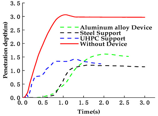 The time-history curve of the bow collision depth is shown in Figure 16 in which, for the three conditions, a small drop can be seen after the curves reach their maximum values. The main reason for this is that the maximum plastic deformation of the bow is accompanied by a smaller elastic deformation during the collision process. The maximum collision depth of the bow with the UHPC support elements is 1.42 m, which is 53.6% lower than that of an unprotected condition (3.06 m), while the maximum collision depth of the bow with the steel support element is 1.21 m, which is 60.5% lower than that of the unprotected condition, and the maximum collision depth of the bow with the aluminum alloy support element is 1.61 m, which is 47.4% lower than the maximum bow collision depth of the unprotected condition. It can be seen that the collision depth of the bow is significantly reduced under all three conditions, which proves that the collision avoidance device has excellent protection performance for ships. When the supporting element uses the steel support, the system kinetic energy is converted into internal energy with the largest amplitude and the smallest bow collision depth, indicating that the plastic deformation of the bow absorbs the least amount of energy, and the system kinetic energy is more transformed into the internal energy of the collision avoidance device, which is more favorable as it reduces the depth of the ship’s impact and protects the ship.