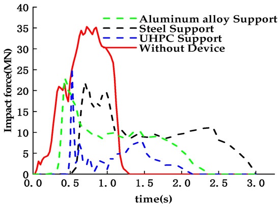 The time-history curves of the impact force under the three kinds of the collision avoidances and the unprotected condition are shown in Figure 18. The peak value of the impact force under the unprotected condition is 35.30 MN, and the impact duration is only 1.25 s. The main reason is that the rigid contact between the ship and the bridge can complete the energy conversion instantaneously. The impact force time-history curve of Condition A1 decreases rapidly to 2 MN after reaching the peak value of 25.40 MN, and the impact duration is 1.60 s; the impact force peak value of Condition A2 is 21.88 MN, and the impact duration is the longest, reaching 2.56 s, which shows that the deformation buffer effect is the best; when the high strength aluminum alloy supporting element is used, the impact force peak value is 22.82 MN and the impact duration is 2.1 s.