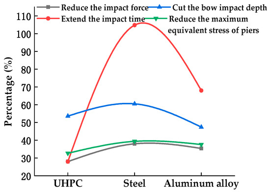 The performance summary of the collision avoidances under the three protected conditions is shown in Figure 19. All three conditions can reduce the peak impact force, prolong the impact duration at a low impact level, reduce the depth of the ship impact, and reduce the maximum equivalent stress on the pier. This shows that the preliminary design scheme of the collision avoidance device is effective and correct. Especially when the supporting element is in steel, the performance of the collision avoidance device is the most efficient, the peak value of the impact force on the pier is the smallest, the impact duration is the longest, and the energy dissipation capacity is the most prominent, which can significantly reduce the damage to both the ship and the pier. Therefore, a steel supporting element is the best choice among the three materials.