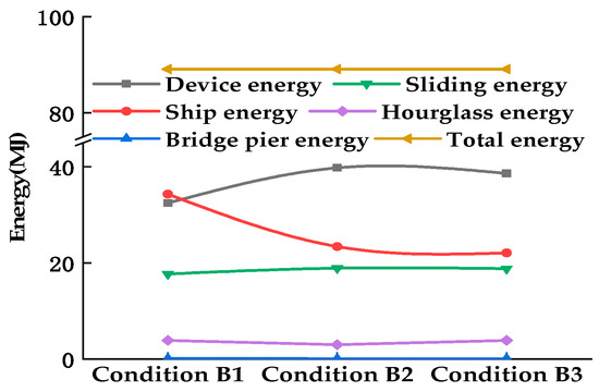 In Figure 20, it can be seen that the total energy of the system remains unchanged, which satisfies the law of conservation of energy. The hourglass energy, slip energy, and total energy absorbed by the piers of the system vary little under the three conditions, and all fluctuate over a relatively small range. The slip energy values for Conditions B1, B2, and B3 are 17.7 MJ, 18.9 MJ, and 18.8 MJ, respectively. The slip energy is increased by 40.5%, 50.0% and 49.2%, respectively, compared with the unprotected condition where the slip energy is 12.6 MJ, which indicates that the components of the collision avoidance device produce very large friction energy dissipation during the collision process, which is consistent with reality. The total energy absorbed by the device deformation is obviously less than that absorbed by the device under Conditions B2 and B3. This shows that, when the wall thickness of the UHPC float box is 150 mm, the rigidity of the collision avoidance device is large, the plastic deformation volume of the bow is the largest, the damage deformation is serious, and the flexible energy dissipation performance of the device cannot be fully utilized. Therefore, the energy dissipation performance values of Condition B2 and Condition B3 are better than that of Condition B1 in terms of energy and ship protection.