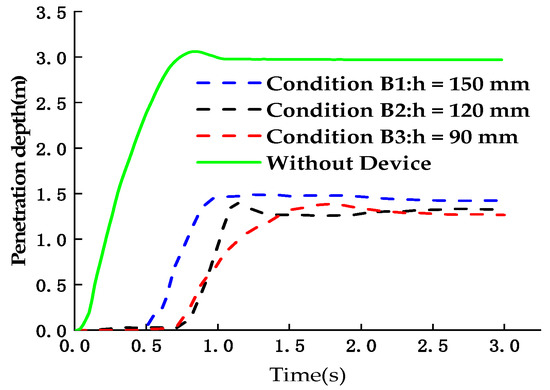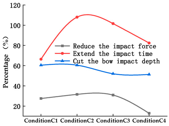 From Figure 21 it can be seen that the bow collision depth curves under the three conditions reach their peak values at approximately 1.0 s, which are 1.5 m, 1.40 m, and 1.38 m, respectively. Compared with the bow collision depth value of 3.06 m under the unprotected conditions, the bow collision depth can be reduced by more than 50%. This shows that the collision avoidance device can significantly reduce the bow collision depth to achieve the effect of ship protection.