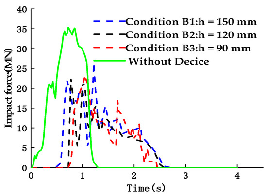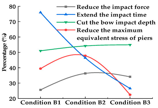 Figure 23 presents the time-history curves of the impact force on the pier under the three protected conditions and the unprotected condition. It can be seen in this figure that for Condition B1, the peak value of the impact force is 26.27 MN at 2.20 s. The reduction in the impact force is 25.6% while the impact duration is extended by 76%. For Condition B2, the impact force reaches its peak value of 22.5 MN at 0.78 s. The maximum reduction of the impact force is 36.3%. The impact duration is prolonged by 46.4% to 1.83 s. For Condition B3, the peak value of the impact force is 23.26 MN. The impact force is reduced by 34.1%, the impact duration is 1.70 s, and thus, the impact duration is prolonged by 26.5%.