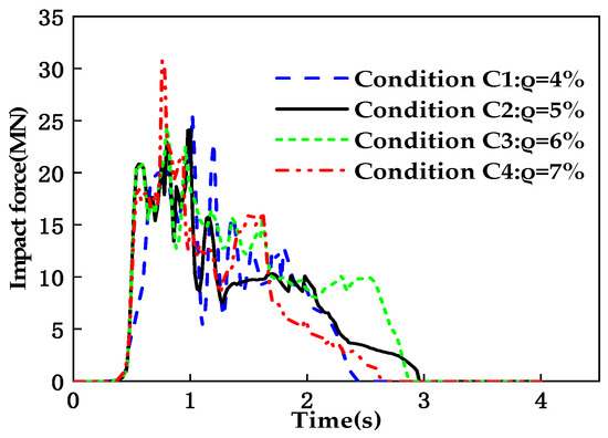 Based on Figure 28, the optimal reinforcement ratio of the collision avoidance device is determined to be 5% by synthesizing the impact depth of the ship, the maximum impact force on the pier and the extension of the impact duration under the four protected conditions compared with the unprotected condition.