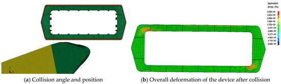 Deformation and stress nephogram of the collision avoidance device at 0° forward collision.