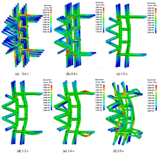 Figure 33 shows the deformation and equivalent stress diagram of the floating box steel support member under the condition of 0 ° frontal collision. It can be seen that the buckling deformation of the frame type steel support elements is large, which has a high plastic deformation energy absorption effect. At 0.6 s (initial impact), the impact effect of the stressed transverse brace and the node has higher equivalent stress, but as the equivalent stress is transferred to the whole frame support, the equivalent stress level in each member decreases, then the transverse brace and longitudinal brace begin to buckle, and the transverse brace begins to buckle first compared with the longitudinal brace, and finally the whole frame support element produces larger deformation, so as to absorb the collision kinetic energy of the ship.