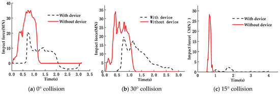 Comparing the impact forces under the three selected impact angles in the protected and unprotected structure, as shown in Figure 35, the impact force curves have significant nonlinear fluctuation characteristics. Each peak value and the unloading of the impact force curve represent the stress-strain wave transmission during the impact process, which causes the failure or damage to the ship or a part of the collision avoidance device.