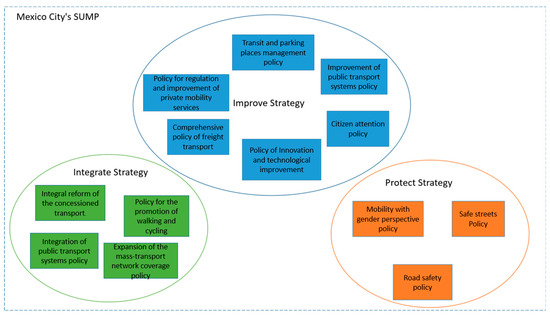 The aforementioned Federal government of Mexico, along with the government of Mexico City, proposed a SUMP with its associated strategies, policies, and lines of actions (Figure 3) in order to neutralize the actual problematic situation in terms of mobility, and to support the new mobility paradigm.