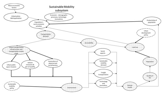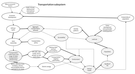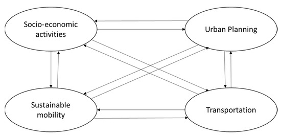 To provide guidelines for the implementation of sustainable mobility plans, we applied a CLIOS systemic analysis. The term CLIOS stands for complex, large-scale, integrated, open systems, and was conceived by Sussman [59] as a way to capture the characteristics of a type of system of increasing interest for researchers, decision-makers, politicians, and stakeholders. A system is complex if it is composed of interrelated elements (components and subsystems), where the degree and nature of the relationships are not well known in terms of their directionality, magnitude, and time scales. The impact of the CLIOS is of great magnitude, in terms of ample duration and geographical extension. The subsystems of a CLIOS system are integrated via feedback loops. In addition, CLIOS systems include social, political, and economic aspects, which is why they are considered open [60].