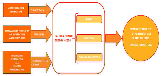 It also sets targets for reducing consumption, increasing the use of renewable energy sources and increasing efficiency by 20% by 2020 and in 2050 an economy with net-zero greenhouse gas emissions []. It also establishes the need for a common methodology for calculating the integrated energy performance of buildings. This methodology should integrate all the elements that determine energy efficiency and not only the quality of the building’s insulation. This integrated approach should take into account elements such as heating and cooling installations, lighting installations, the location and orientation of the building, heat recovery and renewable energy sources, between others.