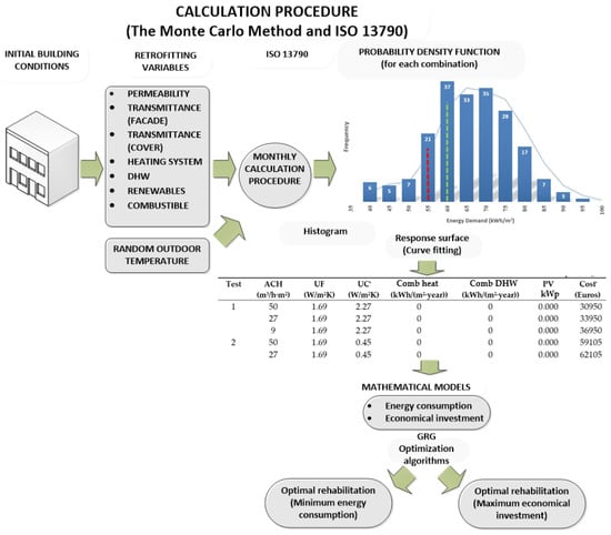 When designing or retrofitting a building, not too many tools let architects and engineers to define the optimal conditions to reduce energy consumption with the minimal economic investment. This is because different software resources must be employed and an iterative calculation must be done which, most of times, is not possible. The present study aims to define an original methodology that let researchers and architects to select the best option between different possibilities. To reach this objective, Monte Carlo method is employed on the ISO 13790 standard reaching the probability distribution of the energy consumption of each building after each possible modification. From main results, two mathematical models were obtained from a real case study showing the relation between annual energy consumption and economic investment of each different building retrofits. What is more, in disagreement with the expected result, the best retrofit option was not the one with the highest cost and qualities. In conclusion, this methodology can be a useful tool for researchers and professionals to improve their decision-making.