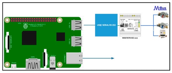 To the hardware of the raspberry, we must add the possibility of M-Bus communication. In this sense, due to most of the boiler rooms have an M-Bus master with RS-232 serial communication, this option was selected. However, it was necessary to incorporate an RS-232 port through compatible USB communication due to Raspberry Pi 3 hardware does not have a serial port. Finally, the complete hardware developed for reading different energy counters is shown in Figure 5.