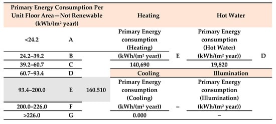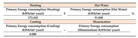 In this case, information such as dimensions, typology of holes and carpentry, domestic hot water (DHW) facilities, boilers and heating installations—among others—were the main input data into the CE3X software. In particular, for all the certifications done, it was defined—for a static value of dry temperatures—to obtain the results of the energy certification shown Figure 7. In this case, the results showed an amount of a total primary energy consumption of 224,500 kWh/m2 year. What is more, from the data obtained from the CE3X unified tool, a consumption distribution of 173,410 kWh/m2 year for heating and 51,040 kWh/m2 year for DHW was observed in Figure 8.