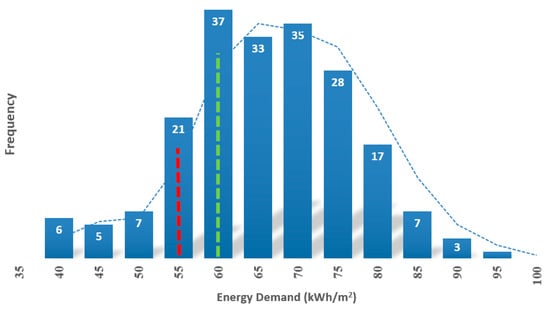In previous research works, it was showed that the combination of stochastic models with optimization is rare in the building sector []. In this sense, since the mid-1940s, some mathematical tools began to be used for this type of analysis based on the Monte Carlo method [], which consists in obtaining a solution limited by the random repetition of innumerable simulations. The random input of values of each variable will lead us to the solution of the problem showing the Gaussian bell of building energy consumption as a function of each input variable. In consequence, with this tool, it was possible to carry out multiple energy simulations by modifying environmental parameters, such as external temperature data, which directly affect the building’s energy consumption.