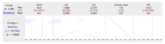 These two Equations (5) and (6) are in accordance with commons sense expectative. In this way, the equation of cost shows a base value of 254,641 euros which is more reduced when the variables ACH, UF, UC experiment their highest values related with the actual conditions and low-cost materials. It is interesting to highlight that it happens when the boiler is not changed (0) due to, in this condition, the photovoltaic electrical production will exert an inverse effect increasing the cost at the time that the PV production increases. When a change of boiler is done, this previous effect of the PV production is modified by new terms of this Equation (1) that now are not neglected.