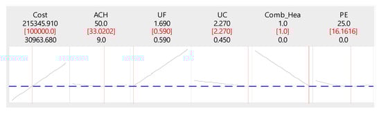 As it was explained before, if the numeric optimization is done without any limitation and supposing that all the variables are continuous, the minimum energy consumption is defined at 35 ACH, 059 UF, 2.27 UF, Comb heat changed to natural gas and a PV of 16.910 kWp, as we can see in Figure 11. What is more, if now the cost is limited to a value of 100,000 Euros, the proposal of retrofits to a minimum energy consumption is similar to the ideal situation and just a little improvement in carpentry (from 35.50 m3/h·m2 to 33.02 m3/h·m2) is proposed, as we can see in Figure 12.