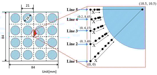 The total length of the rod bundles was 590 mm. The diameter, pitch, and hydraulic diameter are 16, 21, and 14.02 mm, respectively. The cross-sectional area through which the coolant flows is approximately 0.00401 m². The experimentally measured data on Lines 1–5 comparing the numerical analysis results at the cross-section of 580 mm in height are shown in Figure 2.