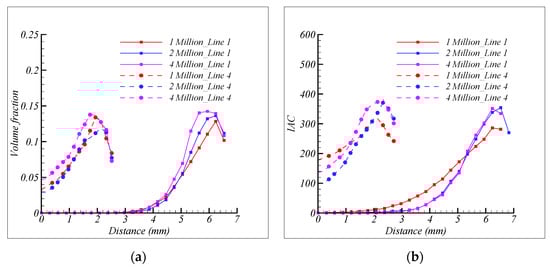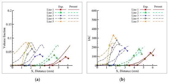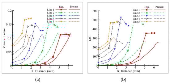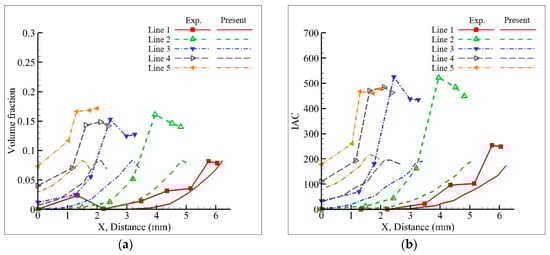 Figure 7, Figure 8, Figure 9, Figure 10, Figure 11 and Figure 12 show the comparison of the results of Lines 1–5 in Cases 1–6. In each figure, (a) shows the volume fraction and (b) shows the IAC.
