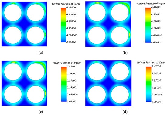 Figure 13 shows the numerical analysis results for the volume fraction distribution contour of all cases for the cross-section with a height of 580 mm. In Figure 13c,d, the volume fraction distributions are characterized by a low value between the rod surface and the wall. However, in Figure 13a,b,e,f, the volume fraction distributions are characterized by a high value between the rod surface and the wall.