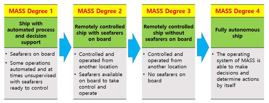 The objective of the IMO RSE for MASS is to assess the degree of autonomy that may affect existing regulatory frameworks in order to address MASS operations. To facilitate the process of the RSE, the degrees of autonomy were categorized into four phases at MSC 99, as shown in Figure 1 [8]. It should be noted that MASS can operate in more than one degree of autonomy during a single voyage.