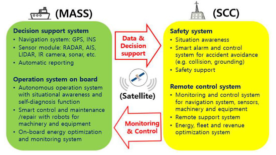 Figure 2 shows MASS and SCC systems with essential equipment and functions and their relationship formed by data and information via satellite.