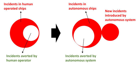 Another important aspect of MASS development is to analyze various hazards of MASSs that can lead to major accidents. Unlike manned ships, autonomous ships are operated by autonomous navigation systems with or without remote control from the SCC, depending on the degree of autonomy, and this might influence the safety of autonomous ships in various ways. On the one hand, the implementation of autonomous navigation systems may improve the safety of autonomous ships because this can eliminate human errors that make up the greatest portion of maritime accidents. It is commonly accepted that human error contributes to approximately 80% of all types of ship accidents [57]. Especially for collision accidents, human error contributes up to 96% [58]. Therefore, it is expected that autonomous ships will have a reduced number of navigation-related accidents, like collisions or groundings, compared to conventionally manned ships [51]. On the other hand, autonomous navigation systems may adversely affect safety. The new technologies for autonomous navigation and increased complexity can introduce new hazards and cause unforeseen system interdependencies [59,60]. It should also be considered that we currently have a large number of incidents that are prevented by human operators, which would be impossible for autonomous ships [61]. These relationships between autonomous ships and reduced/increased incidents are illustrated in Figure 3.