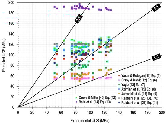 In the case of travertine, the same occurs. Table 3 shows the different linear correlations that relate UCS with vp, (Equations (5)–(9)), with n (Equations (10) and (11)) and ρdry (Equation (12)). Equation (13) corresponds to the multiple correlation that includes the three properties. Figure 2 shows how no correlation fits the experimental results (line 1:1), and Table 3 shows the mean values and relative errors. From these average values, it can be concluded that Equations (5) and (11) are the closest to 101.09 and 105.27 MPa, respectively (they have the lowest relative errors in absolute value). It should be noted that in the determination of these equations no travertine specimens were considered, only limestone, marble, dolomitic limestone, dolomite, marble and graveled limestone.