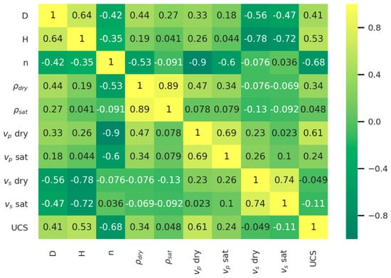 Developing Pearson’s correlation analysis (Figure 3), the positive correlation between UCS and vp,dry is highlighted, and the negative correlation between UCS and n. It is also observed that the UCS dependent variable does not have a strong linear correlation with the other sampled variables, especially with the ρsat, vs,dry and vs,sat variables, where there is no linear correlation (r = 0).